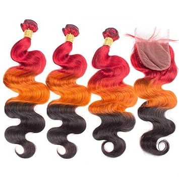 Amazoncom Three Tone Ombre Hair Extensions Body Wave Red Roots Orange And Black Ombre Brazilian Human Hair 3 Bundles With Lace Closure 4x4 Red Orange Black Ombre Hair Weaves 14 16